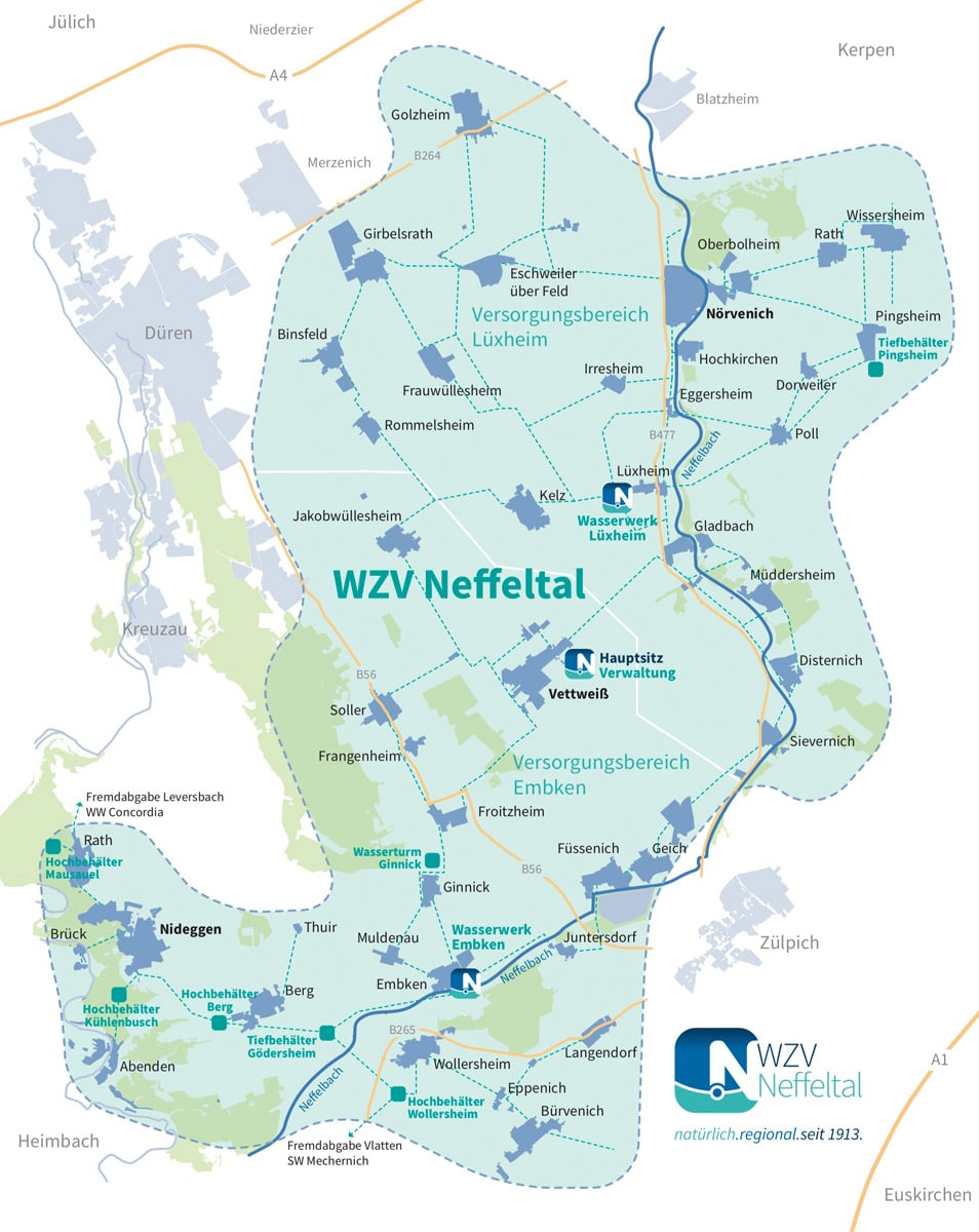 Der Versorgungsbereich des WZV Neffeltal liegt am Rand der Rureifel im Dreieck zwischen den Städten Aachen, Köln und Bonn. Durch den WZV Neffeltal werden täglich über 35.000 Einwohner mit Trinkwasser versorgt. Das eher ländlich geprägte Versorgungsgebiet erstreckt sich über 43 Ortschaften und umfasst insgesamt eine Fläche von über 240 qkm.